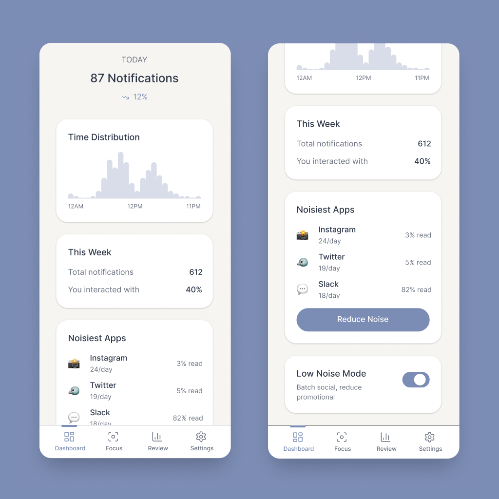 The goal for this screen is two-fold. First, show the user what is competing for their attention. This reveal should move them to take action make use of the app’s primary feature to reduce some of the digital noise in their day. The secondary goal of this screen is to provide a place for the user to understand digital interruptions to their day at a glance.