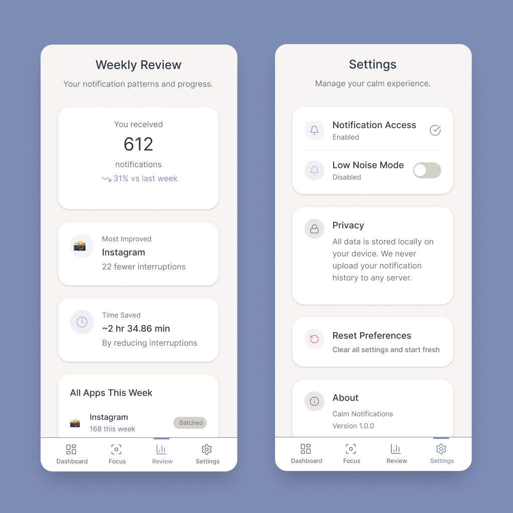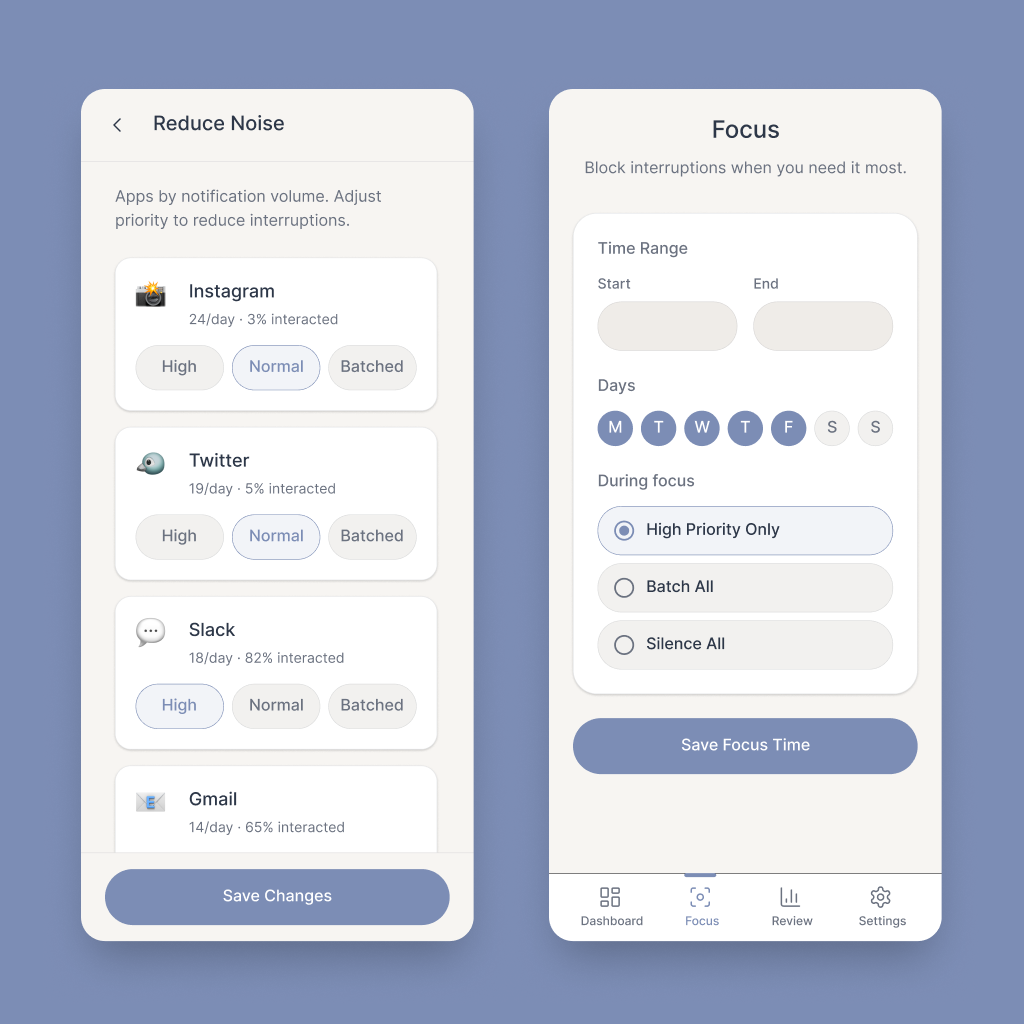 The initial call to action will help users control how often certain applications are permitted to notify them. Social media platforms and shopping apps might be grouped into batched notifications that only appear every few hours. Messenger apps and work email could be given priority and operate unencumbered. This function could be amplified by setting focus times that would increase the reduction of digital noise during particular periods of the day.